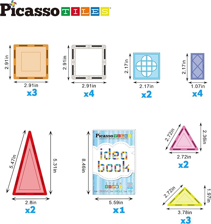 - DREAM BIG & BUILD BIG: Inspire fun, education, and creativity at home or in the classroom with the PicassoTiles magnetic tiles building block construction toy. This set includes:7 Triangles, 7 Squares, 2 Windows, and 4 operable Door Pieces. Enhancing the experience, this playset comes with an Idea Book packed with over 110 pages of creative inspirations. Tailored for ages 3 years and older, it encourages enjoyable learning, encouraging boys and girls alike to explore and create.