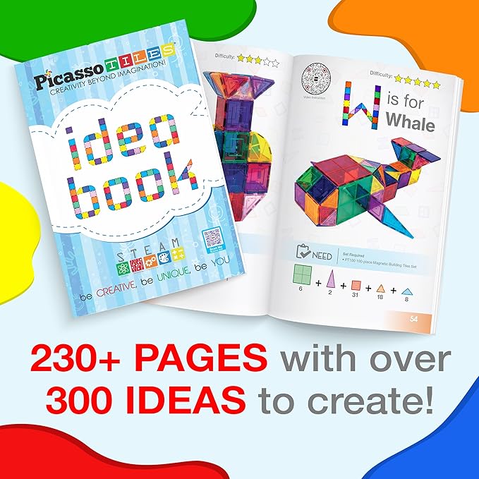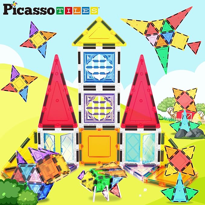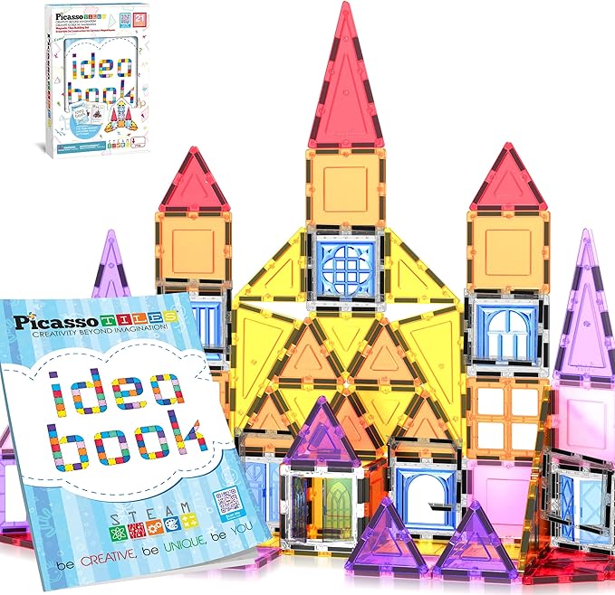 PicassoTiles Magnetic Tiles Magnet Tile Building Blocks Construction Set with 110+ Page IdeaBook Included STEM Learning Toys Toddlers Educational Fun Pretend Play Kids Boys Girls Sensory Toys Ages 3+