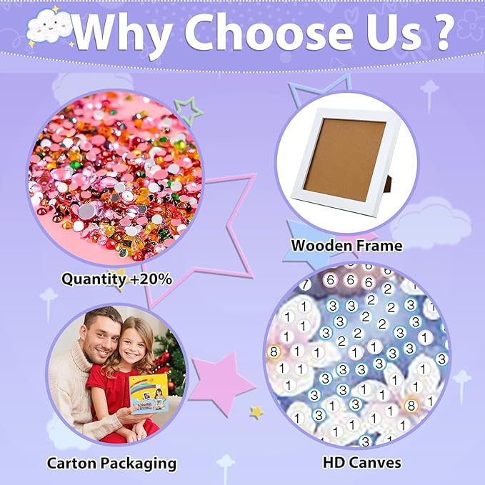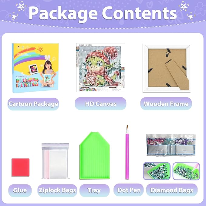 - Best Choice for Kids:Our kids Diamond Art Painting kits come with pre framed.The cute pictures and exquisite packaging are perfect for birthday and Christmas.You can put the finished product on the table or hang it on the wall at home,such as in the baby room,living room, etc.It will be a perfect home decoration full of success.