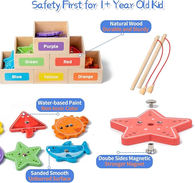 - 【Double-sided Magnet】With double-sided sealed magnet, better attract wooden fish and will not fall off midway. Learning toys that helps exercise children's motor skill, hand-eye coordination, and their ability to match shapes and colors