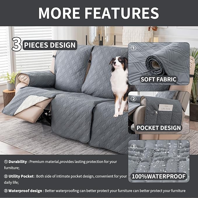 Easehomey Waterproof Recliner Sofa Cover,Non-Slip Reclining Sofa Covers for 3 Seat,Washable Reclining Sofa Cover Furniture Protector with Elastic Straps Pocket for Kids, Pets(Dark Gray,3Seat)