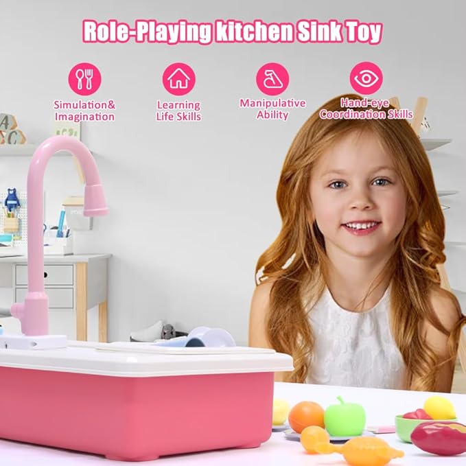 Play Kitchen Sink Toys with Running Water, Toddler Electric Dishwasher Playing Toy with Cutting Foods, 33 PCS Pretend Role Play Accessories Set, Learning Gift for Girls Boys (Pink)