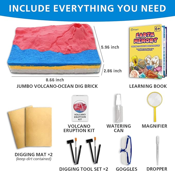 - EXCITING VOLCANO ERUPTION EXPERIMENTS: In addition to gems & fossils for kids to dig up, this digging toy set enhances digging activities with an interactive eruption experiment. Using non-toxic, food-grade materials, kids aged 6+ can simulate a volcano eruption multiple times, deepening their understanding of both science experiments and volcanic activity