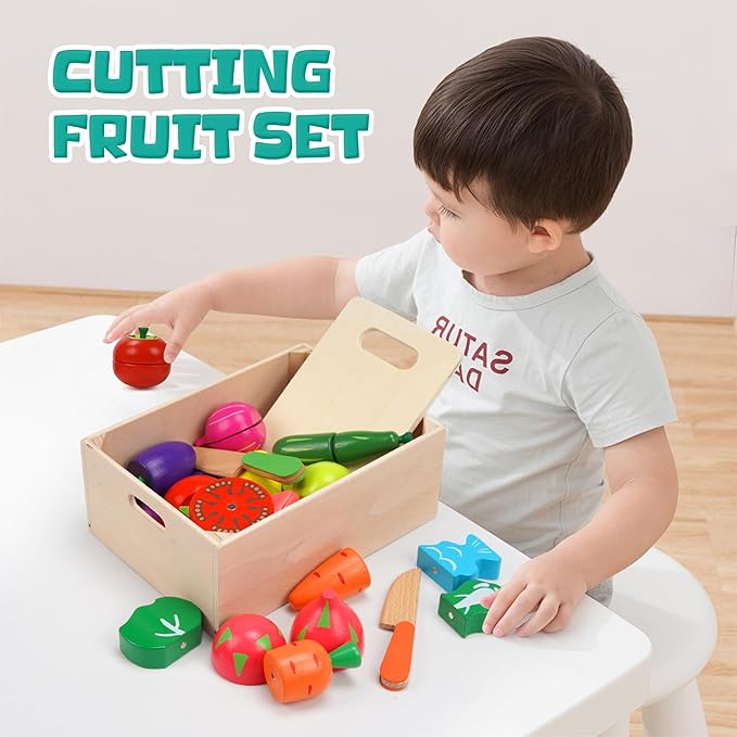 • IDEAL GIFT FOR TODDLERS: This pretend wooden play food toys is an ideal birthday or holiday gift for kids, awesome for holidays, travel time, party or any occasion. Our toys are a great alternative to screen time. Children can enjoy games through cutting and matching with more fun and laughter.