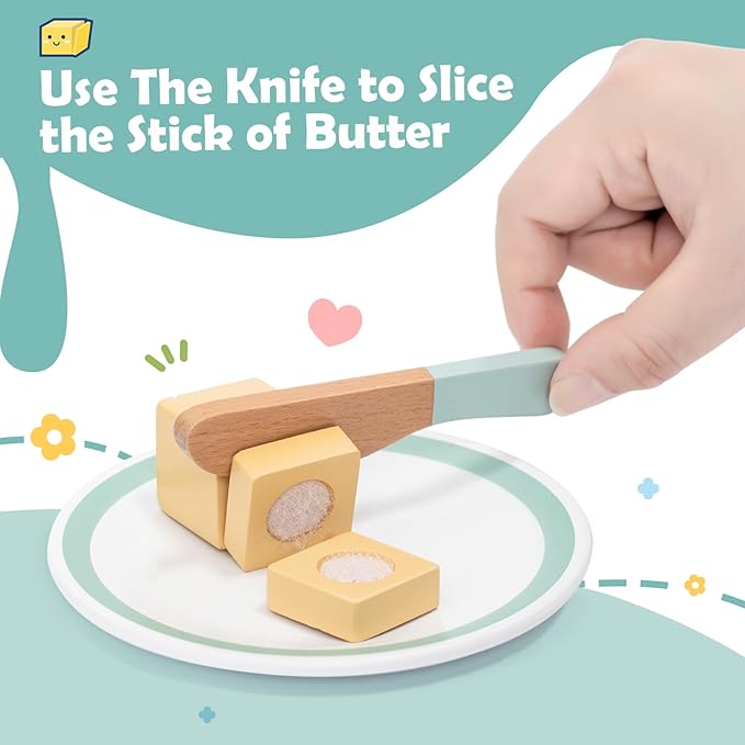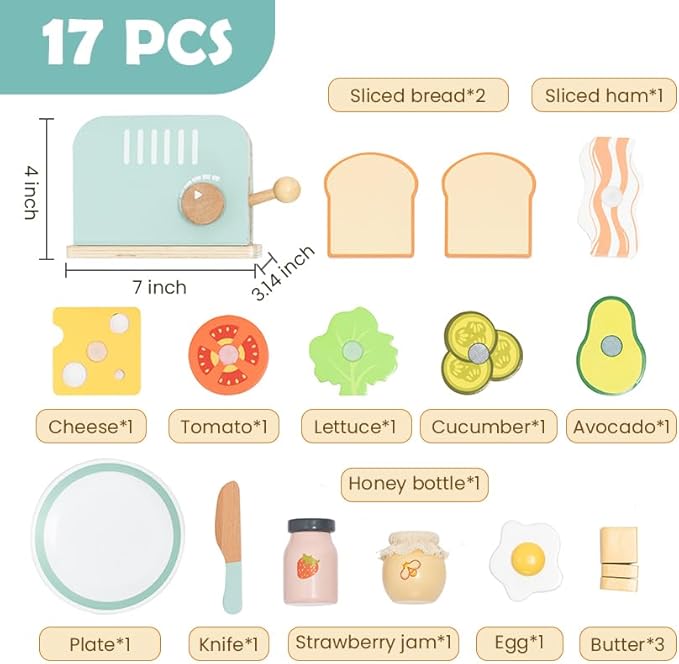 - 【17 Pcs & Realistic Design】: This wooden pop-up toaster toy kitchen set contains a high quality wooden toaster with an ingenious designed baking set, which includes pop-up toaster ,3 slices of butter and 2 slices of bread,1 knife,1 plate,1 cheese,1 poached egg,1 lettuce,1 tomato,1 cucumber,1 sliced ham,1 avocado,1 strawberry jam and a bottle of honey.Real looking wooden toy toaster design is a wonderful addition to the kid's pretend play. Children can adjust their fire size by rotating the buttons, hit the lever and pop the toaster up!