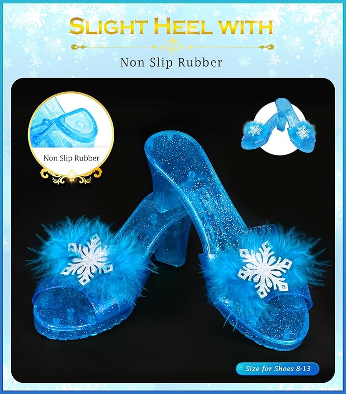 - 14PCS Kids Makeup Kit for Girls of Decent Quality: Kids makeup kit for girl includes hairbrush*1, makeup brush*5, eyeshadow*1, lipstick*1, mascara*1, powder*1, blush*1, nail polish*2, powder puff*1. Beautiful and very sturdy will definitely last a toddlers rough play. Toddler princess dress up shoes are not high with tiny grip pieces on the bottom, easy for little girl to walk in.