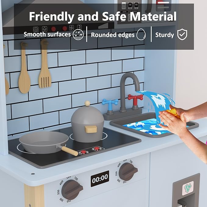 - 【PREMIUM QUALITY AND SAFE FOR KIDS】We have strict requirements for the wood of each play kitchen, made of environmentally friendly non-toxic wood, bpa free, and the accessories are also made of solid wood.Wooden play kitchens have smooth surfaces, rounded edges and sturdy, durable structures that kids can play on.