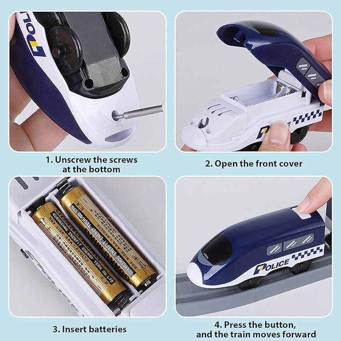 - REALISTIC TRACK SOUND: The railway vehicle toy set is suitable for ages 2-8 year old boy and girl. This cute blue police topic train set is perfect for toddlers and will inspire hours of imaginative play. Install the battery, press the switch, and the train will move forward immediately with real and lively track sounds, it will catch babies' eyes