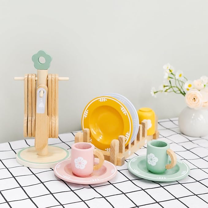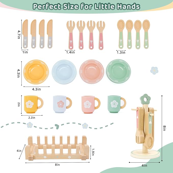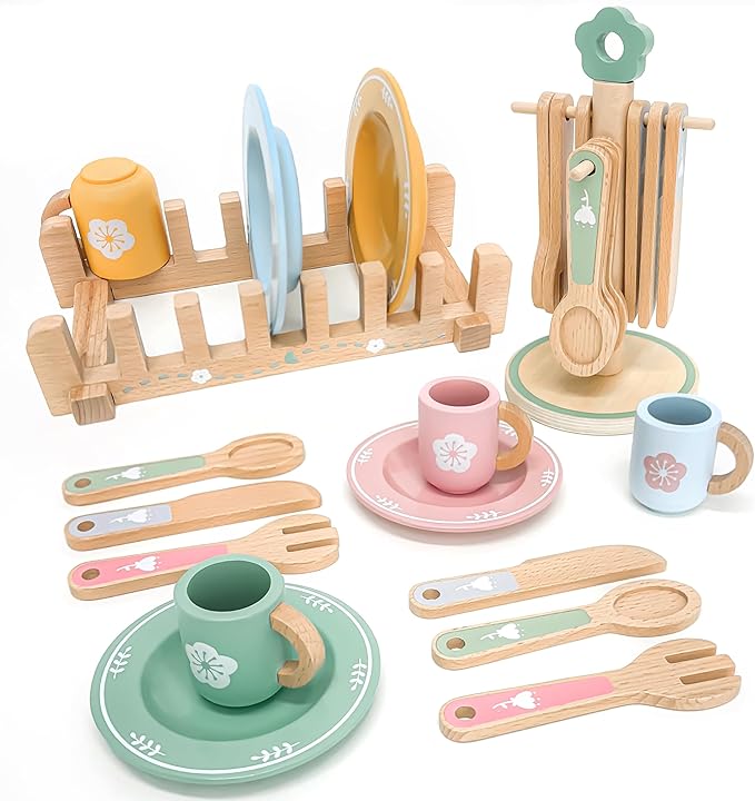 • 22 PCS wooden dinnerware set for toddlers -- This 22PCS Wooden Play Kitchen Accessories Toys includes 4 plates, 4 teacups, 4 knives, 4 forks, 4 spoons, 1 cutlery rack and 1 dish rack. Children can join in on this pretend play and share the fun together!