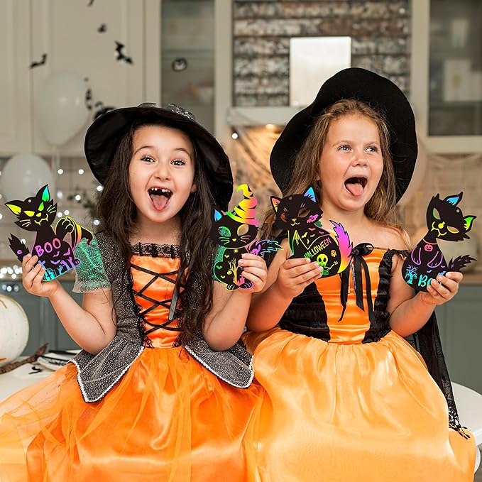 - What You Can Get: There are altogether 60 pieces of Halloween black cat scratch cutouts, a total of 6 styles, 10 pieces each. The product also comes with a gift box, 20 sticks and 1 roll of ribbon. You can not only design the scratch cards by yourself, but also share the hands-on happiness with your good friends.