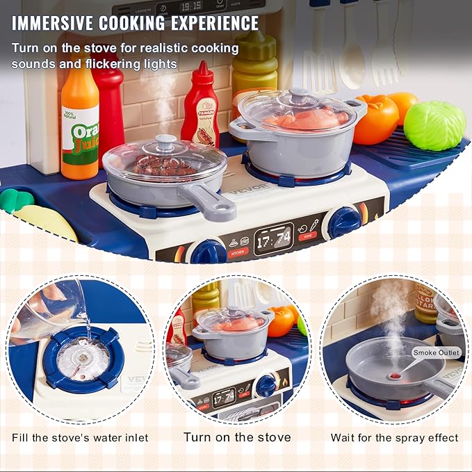 - Fun Realistic Cooking: Future chefs will love this kids kitchen playset! Kids can dress up in the included apron and chef hat, wash ingredients at the sink, cut them with toy utensils, and cook them on the stove. The stove has click knobs, flashing lights, and steam effects for a realistic touch. After cooking, they can add seasonings and enjoy their creations!