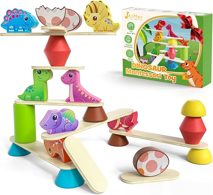 - A Thoughtful and Educational Gift: Whether for birthdays, holidays, or just because, this stacking and balancing toy set is a perfect gift that combines fun with education. The vibrant dinosaur shapes and geometric designs are sure to captivate children’s imaginations. Plus, the included storage box ensures that cleanup is easy and everything stays organized. Give the gift of learning with this dynamic and engaging toy set.