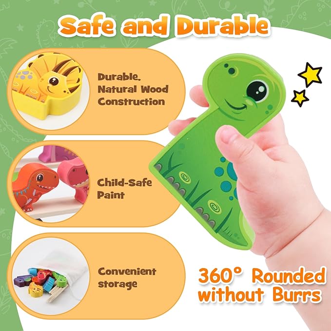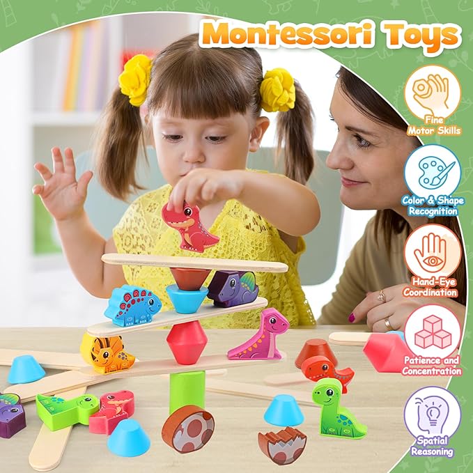 Montessori Dinosaur Toys for 1 2 3 4 Year Old Toddlers, Early Education Toys for Ages 2-4 Boys Girls Kids, Wooden Dinosaur Blocks Sorting & Stacking & Balance Toys, Ideal Preschool Birthday Gift