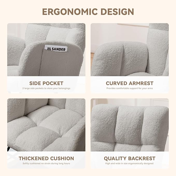 COMHOMA Nursery Rocking Chair, Teddy Upholstered Glider Rocking Chair with Side Pockets, Accent Chair with High Backrest Reading Chair for Adult, Nursery, Bedroom, Living Room,Offices (Grey)
