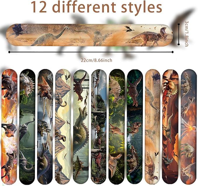 - Package Includes: This is a great set of dinosaur party favors, huge variety of different dinosaurs and other prehistoric themed art; You can get 36 pcs dinosaur tattoo stickers in 36 various styles, 24 pcs realistic dinosaur patterns dinosaur slap bracelet