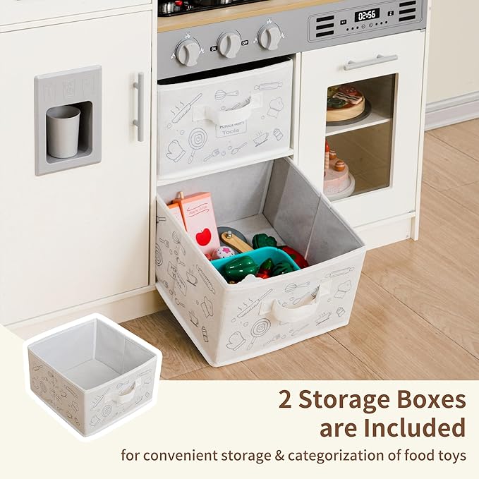 - [Plenty of Storage Systems] : The Toddler Kitchen has plenty of storage space, guiding children to categorize storage and develop self-storage habits. And develop good habits of organizing items.