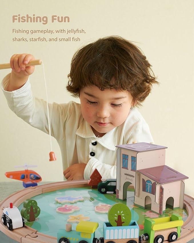Wooden Train Track Set - 48-Piece Toy Train Tracks Compatible with Thomas, Brio, Melissa & Doug - Includes Fishing and Puzzles for Toddlers 3-8 - Educational for Fun Playtime