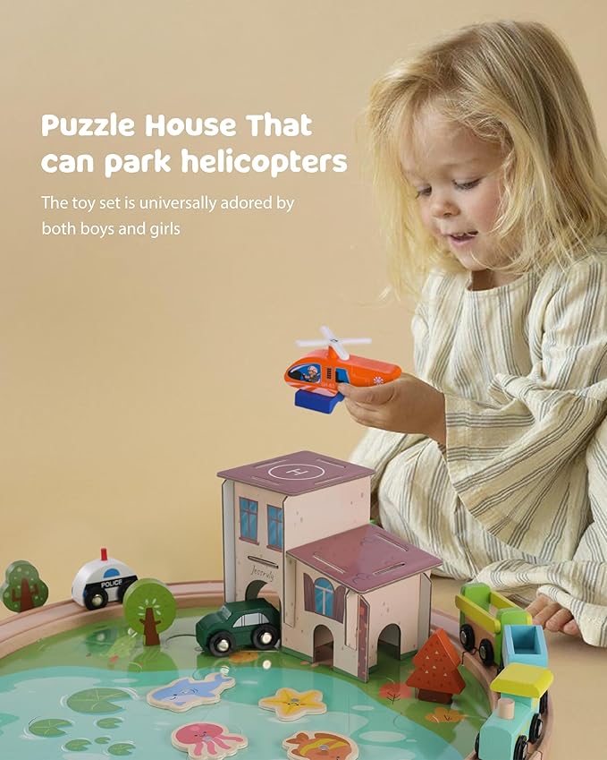 - Rich Accessories: The Jessruly Wooden Train Set includes 3 train cars, 8 tracks, 2 cars, 1 airplane, 16 puzzle pieces, a mini house, 4 fishing toys, and 3 trees—ideal for sparking your child's imagination