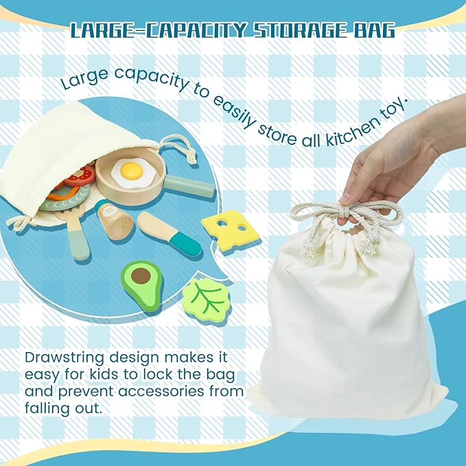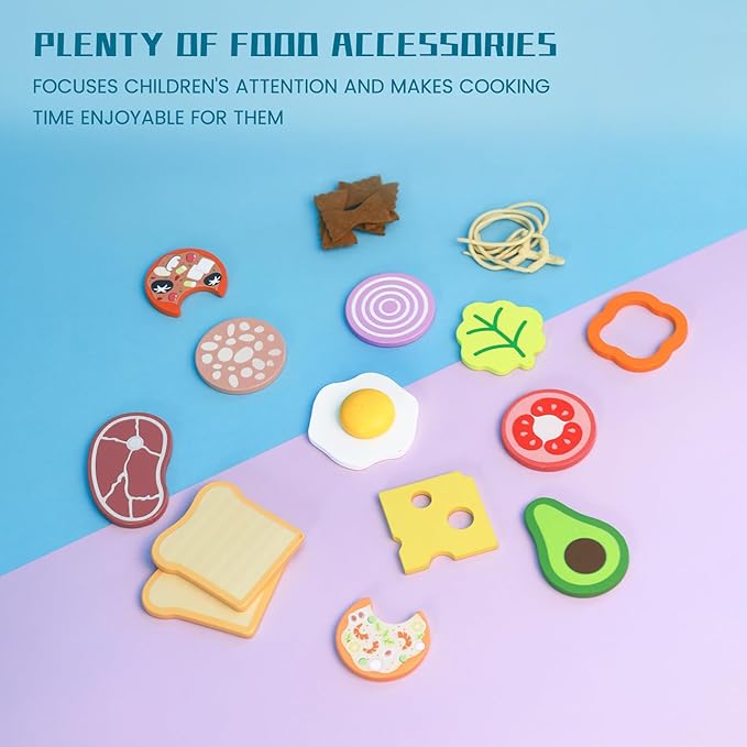 • SAFE KIDS PLAY KITCHEN TOYS -- This Wooden Play Cooking Set is made of natural wood and non-toxic water-based paint, with smooth edges and corners that won't hurt your child's little hands. This wooden kitchen toys can provide a safe and creative play experience.