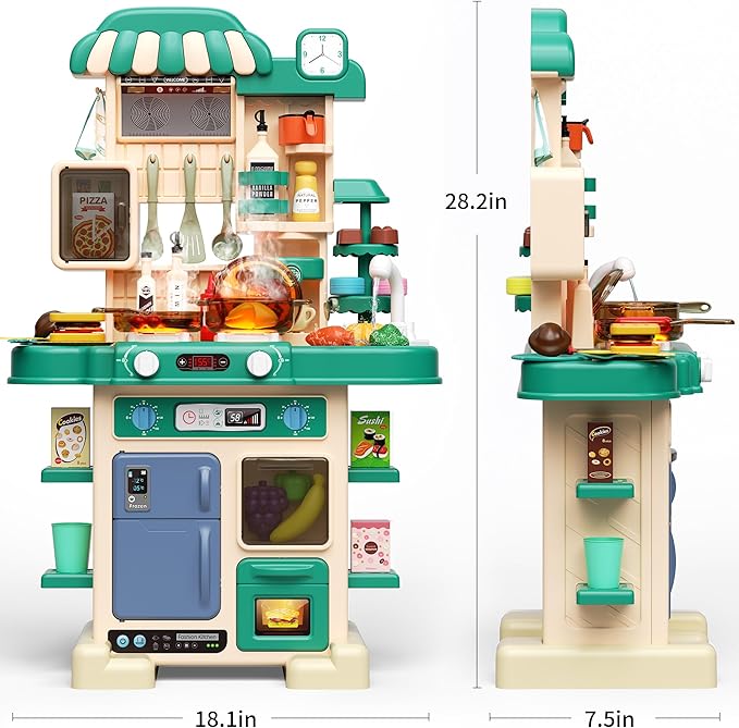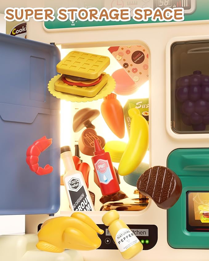 - 【Immersive Kitchen Play Experience】Dive into the world of cooking with this fantastic interactive toy kitchen set! Featuring a glowing electric stove, realistic cooking sounds, a running water sink, various toy foods, and kitchen accessories. Stay organized with ample storage including a refrigerator, oven and shelf.