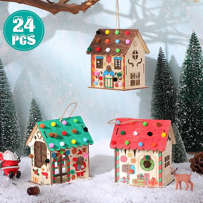 DoubleFill 24 Pcs Wood Gingerbread House Craft Kit for Kids DIY Wooden Christmas Birdhouse Craft Kits Holiday Village Houses Make a Gingerbread Wooden House for Xmas Party Game Craft Supplies