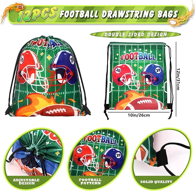 - EXCITING THEME DESIGN: Our football party supplies kit is our carefully customized product. The drawstring backpacks come in 8 intricate designs printed various football related patterns on the front and back like footballs, helmet and trophy. You can adjust the size of the backpack opening by pulling on the string, perfect for holding all the exciting party gifts, and for your little guests to take home their goodies