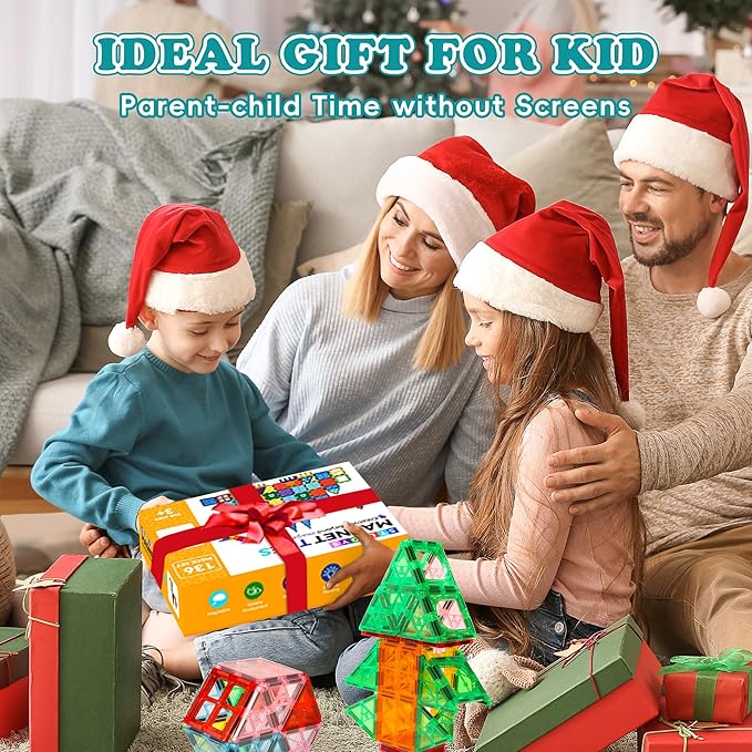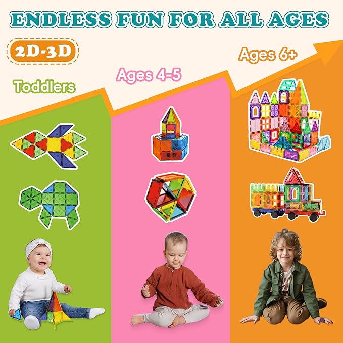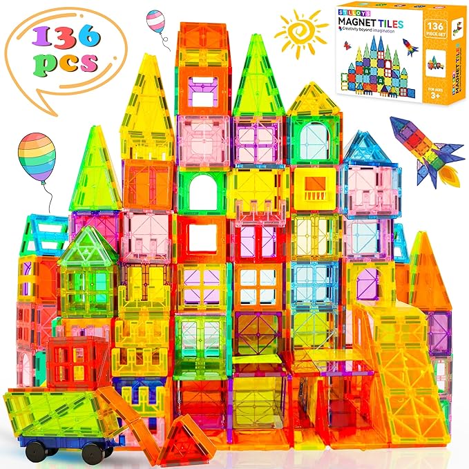 - 【136 Pcs Magnetic Tiles】Stlloys magnetic building blocks come with 136 vibrant pieces in various shapes. Kids can explore shapes from simple 2D patterns to intricate 3D structures, crafting anything from castles to vehicles. This set promotes imagination and is ideal for ages 4-8