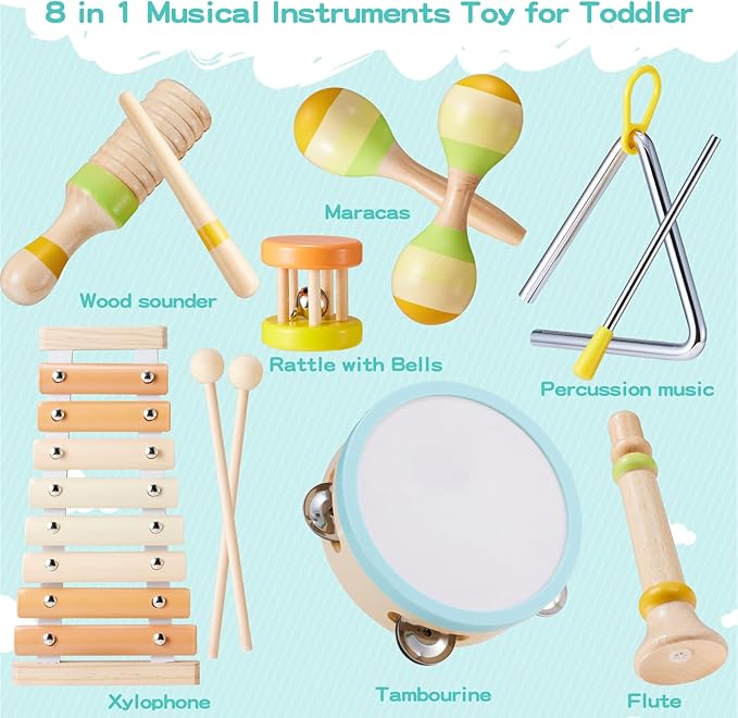 - 【NEWEST 8 in 1 Musical Toys for Toddlers 1-3】: This adorable musical instruments with neutral colors includes an 8-tone xylophone with mallets, a tambourine, two maracas with differents head, a trumpet, a triangle with striker, a wooden rattle with bells and a wood sounder. A full set of montessori musical toys to meet your baby's different musical needs, perfect preschool educational toys for 1 2 3 year old.