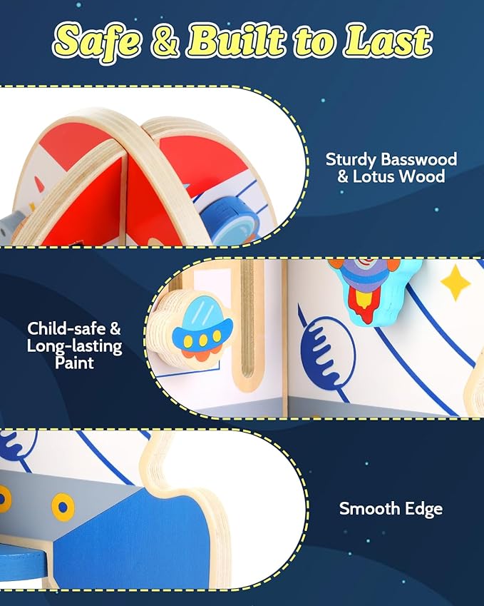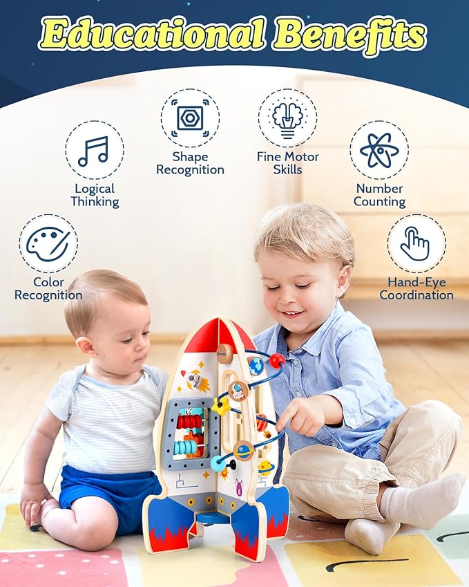 Baby Space Rocket Wooden Activity Cube Montessori Toys, 6-in-1 Sensory and Educational Learning Toys with Bead Maze Abacus, STEM Developmental Birthday Gifts for Toddler Boy Girl Ages 2 3 4