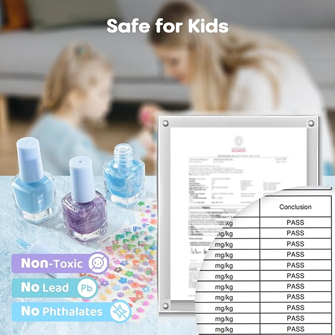 - Safe and Peelable: No nail dryers needed, just apply and wait 3 minutes for it to dry. The water-based formulas ensure easy cleaning and peeling off without the need for polish remover, gently caring for your kid's nails