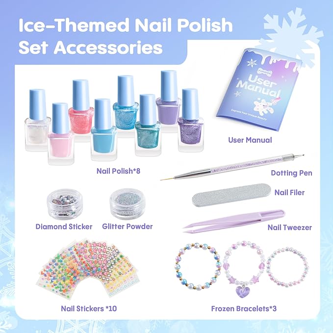 - Nail Art Set for Girl: Our nail polish set includes 8 nail polishes(include 5 metallic glitters), 10 nail stickers, 2 glitter powders, 3 bracelets, plus essential tools like a nail tweezer, nail filer, nail pen and diamond sticker