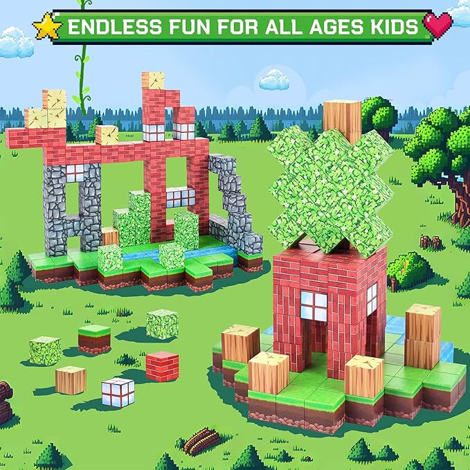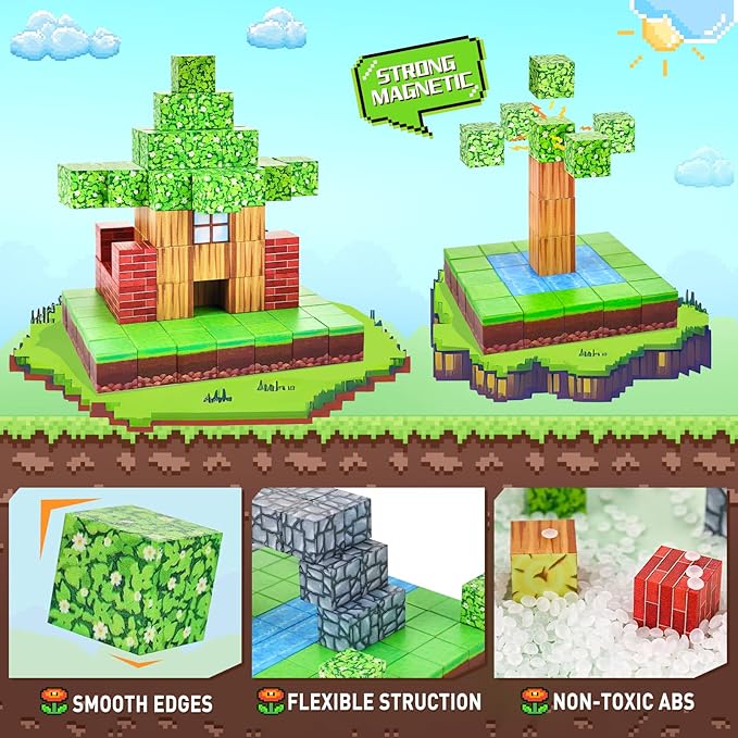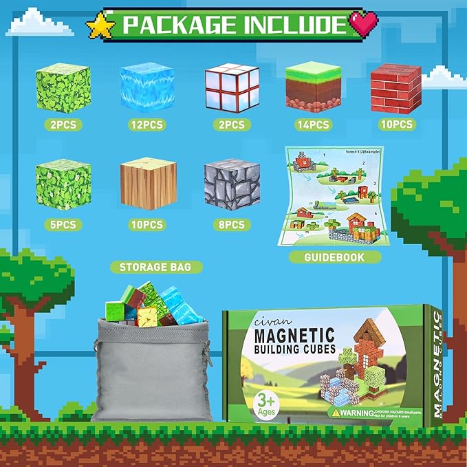 - 【Adventure Magnetic Toy】Civan Magnetic building toys bring the excitement of adventure game to life, opening up a fantastic world of possibilities and experiencing the hottest trends in game. This new magnetic block set contains bricks, water flow, grass, trees and many other elements to create a variety of games, different shapes of buildings and scenes, bringing kids into a world where games and creativity intermingle, especially for gamers who love to explore and build in the virtual world.