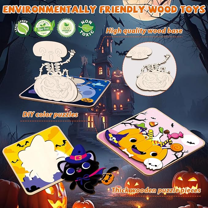 - Color your own kit with our background - Our DIY Halloween Painting Craft is designed with clear lines for easy coloring in different areas. Your child can color their DIY craft wood cutouts with their favorite colors and use their imagination to complete it. Nice for kids to express their creativity and enjoy Halloween-themed art activities. Meanwhile, Halloween craft kit includes a robust wooden storage tray beneath the puzzle pieces, helping kids identify where each piece belongs.