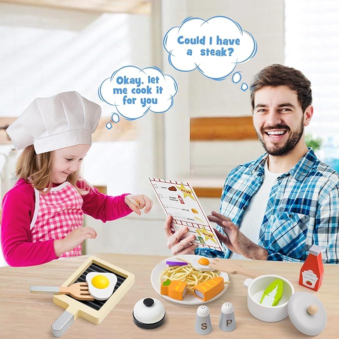 • RICH GAMEPLAY: Imagine how fun it would be to play house with the children as customers, cooks and waiters. Customers ring the bell, order what they want on the menu, and our chef donned a hat and apron to cook delicious steaks, pasta, soups and snacks, and the waiter wore gloves to bring the food to the customer, what fun it will bring to the children! In addition, we carefully use high-quality wood, which is finely polished to protect the soft hands of children