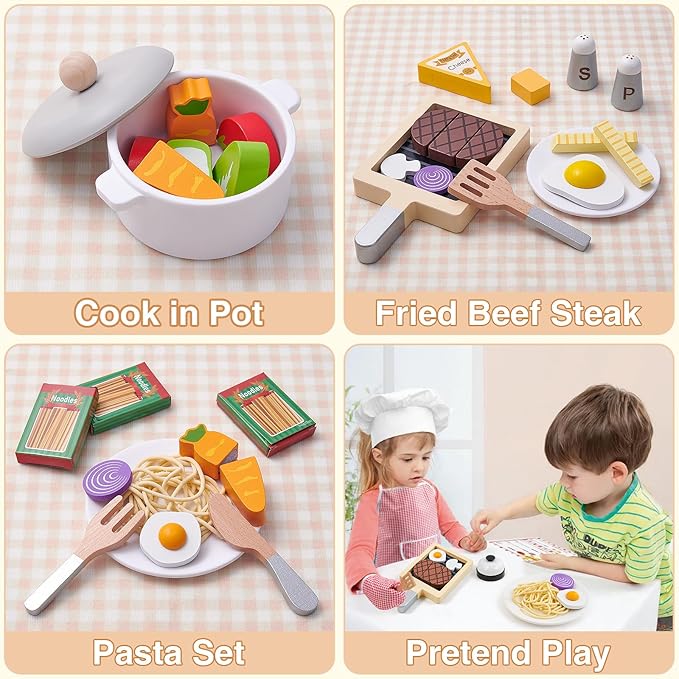 Wooden Play Kitchen Accessories for Toddlers 3-5, Play Food Sets for Kids Kitchen with Costume & Steak & Pasta & Utensils, Pretend Cooking Toys Christmas Birthday Gifts for Girls Boys 3 4 5 6