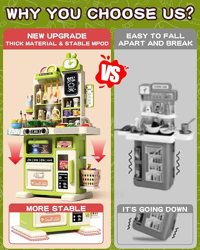 - [Realistic Cooking Simulation] Turn on the stove for a realistic cooking experience with lights, sounds, and steam effects. Enhance authenticity and immerse children in a lifelike cooking adventure.