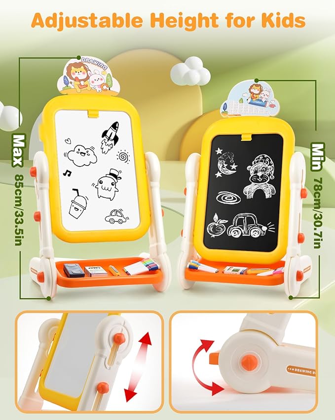 - Easy Assembly & Adjustable Height: You have the option to choose between two leg lengths based on your child's height and preferences. Tool-free setup with hand-tightened screws makes assembly a breeze. Gleamkid little partners easel has adjustable height from 78 to 85 cm (30.7 to 33.5 inches) accommodates kids of various ages, while the board can be tilted or rotated using base screws, satisfying different needs