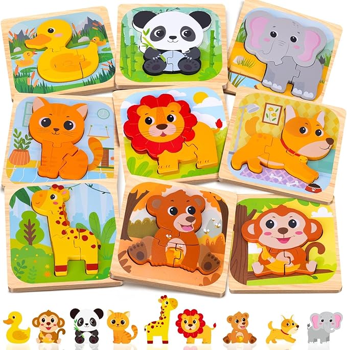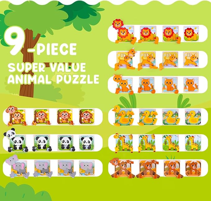 - SUPER VALUE 9 TODDLER PUZZLES SET: Our animal toddler puzzle set features 9 delightful and brightly colored wooden puzzles, each shaped like a different adorable animal. This educational toy for toddlers aged 1-3 and 2-4 is not only designed for entertainment but also enhances your child's understanding of the natural world, while keeping all pieces neatly organized.