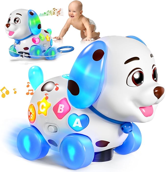 - Crawling and Walking Baby Toy: Attracted by various music and colorful lights, baby 6-12 month, 9+ months will try to crawl after this musical toy when it walking around with music playing. This baby toy 12-18 months also help baby and toddler 1+ year old to walk. It come with 4 ropes, it is a adjustable length pulling toy and the pull-along feature encourages mobility and coordination