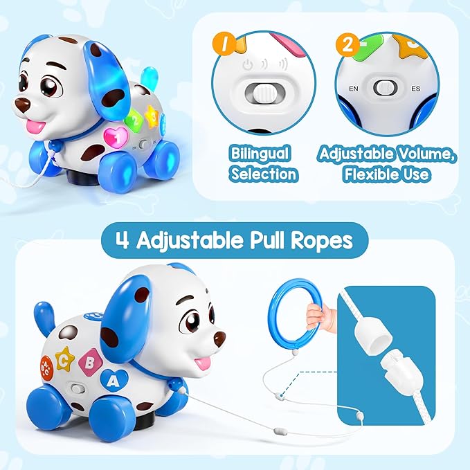 - Bilingual Educational Toy 1 Year Old: With English and Spanish Mode, your one year old boy and girl can learn number, letter and songs with dual language. 1 year old boy toy, bilingual toy for 1 year old girl. With 2 level of volume, this musical puppy toy is toddler-friendly