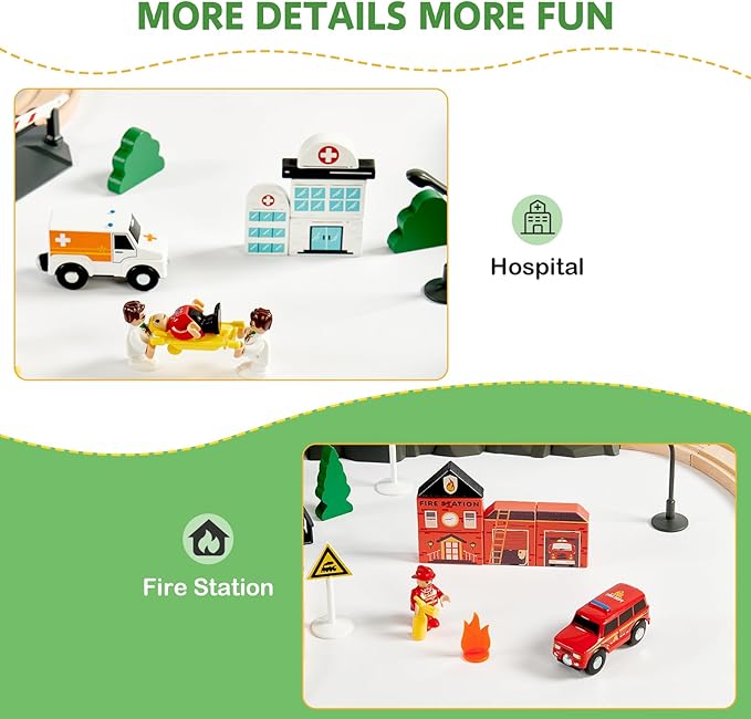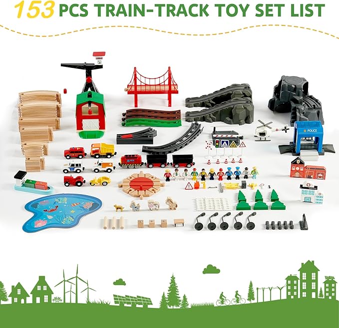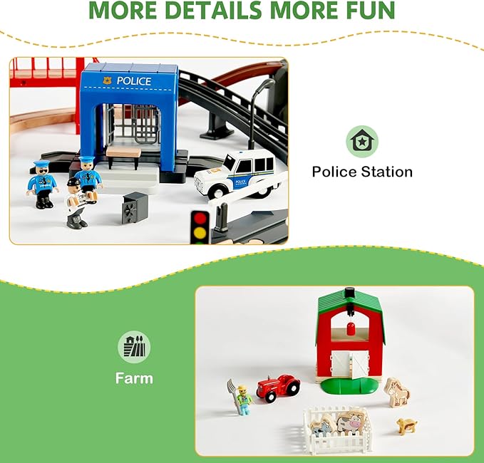 - 153PCS Wooden Train Set for Endless Fun: Joylike wooden train set includes 153 pieces featuring premium wooden tracks, themed building blocks, and various accessories. With six exciting themes-Hospital, Fire Station, Police Station, Farm, Construction Site, and Dock-kids can enjoy endless creative building and role-playing possibilities. Perfect for family time or group play!