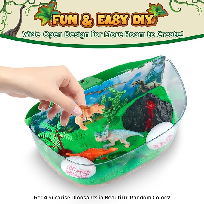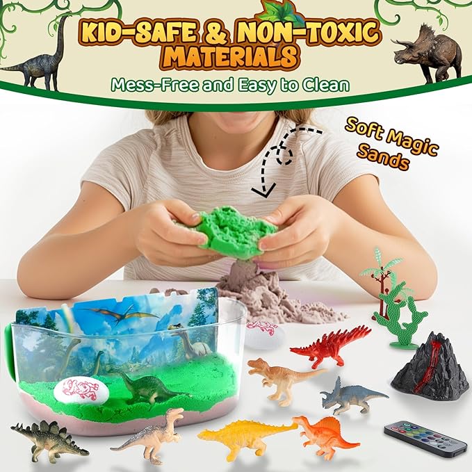 - Kid-Safe, Non-Toxic Materials - Mess-Free Fun: Our dinosaur terrarium kit is crafted from child-safe, non-toxic materials, ensuring a worry-free play experience. With soft, easy-to-mold magic sand and sturdy, durable accessories, the crafts kit is designed for hours of mess-free creativity. Perfect for hands-on activities, kids can play independently or with family for a bonding experience
