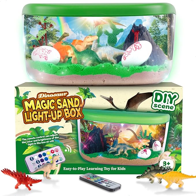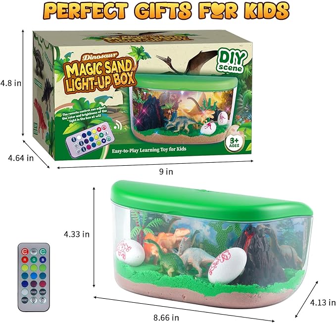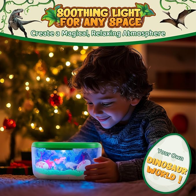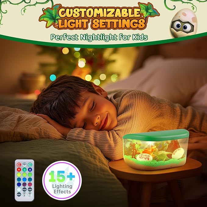 - 15+ Customizable Lighting Effects - Magical Night Light for Kids: Transform your dinosaur terrarium into a soothing nightlight with over 15 customizable lighting effects. Kids can use the remote to choose their favorite colors, modes and brightness, making the Light-Up Box a calming addition to bedtime. Perfect for creating a magical, prehistoric ambiance kids will love!