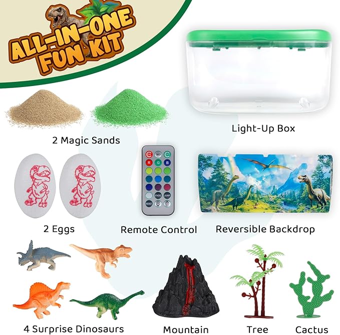 - Build Your Own Dinosaur World - All-Inclusive Craft Kit: Create an immersive prehistoric scene with this DIY dinosaur light box! The kit includes 4 surprise dinosaur toys, 2 magic sands, 2 dinosaur eggs, a mountain, tree, cactus, a night light box with remote, and a reversible backdrop. Kids can arrange their mini-dinosaur habitat, making it a unique and creative adventure for dinosaur enthusiasts ages 4-6 5-7 8-12