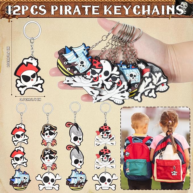 - Pirate Party Favors - Package include 48pcs, serve for 12 kids. We offer 12 pirate drawstring bag(3 styles), 12 pirate silicone bracelets(3 styles), 12 pirate keychains(6 styles), 12 pirate tattoo stickers complete set for you to use as favors at the party. Pirate birthday theme party favors added many types of pirate elements, which are attractive and creative, especially suitable for little boys.