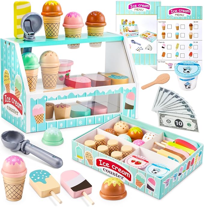 - IDEAL GIFT: This wooden ice cream stand toy is fun and beautiful, can be used as an ornament when not in use, and can be used with other toddler kitchen accessories and play food toys. It is the ideal birthday gift, back-to-school gift, or Christmas gift for 3+ year-old boys and girls