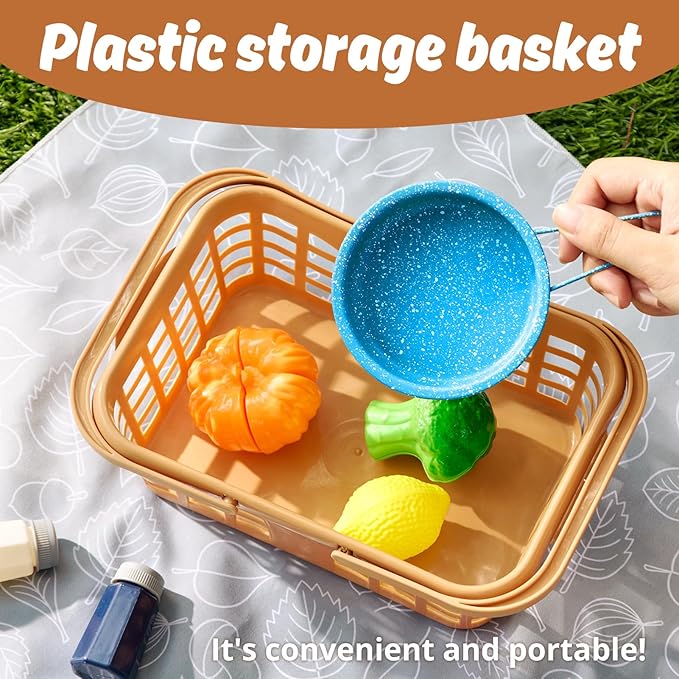 - 🌈【 Kids Play Kitchen Accessories 】— 14PCS set includes: One colander, one stockpot, one pan and one low pot, comes with one covers, one spatula, one ladle, one draining spoon, one spaghetti server, one table mat and 2 spice bottles. There is also a carrying basket to store all the kitchen utensils.