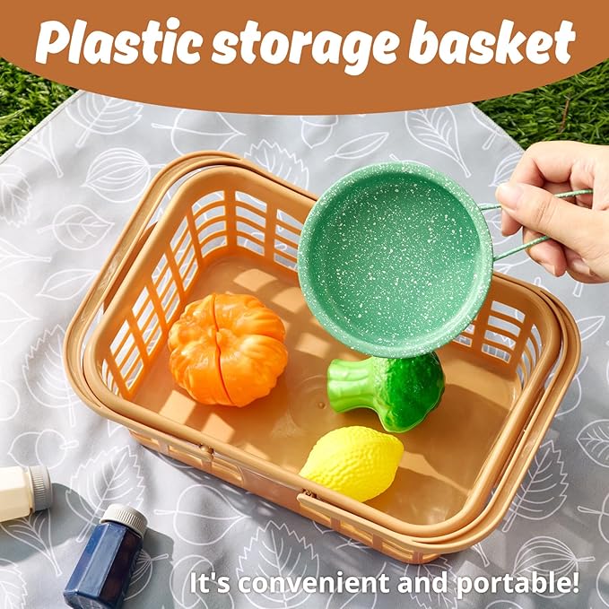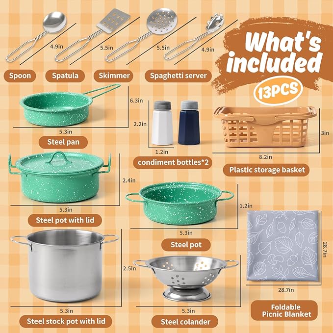 - 🌈【 Kids Play Kitchen Accessories 】— 14PCS set includes: One colander, one stockpot, one pan and one low pot, comes with one covers, one spatula, one ladle, one draining spoon, one spaghetti server, one table mat and 2 spice bottles. There is also a carrying basket to store all the kitchen utensils.