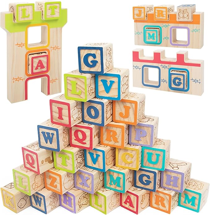 Wooden Building Blocks for Toddlers 2-3, ABC/Animals Castles Montessori Toys, Preschool Learning Toys Stacking Block for Preschool Girls and Boys Gifts