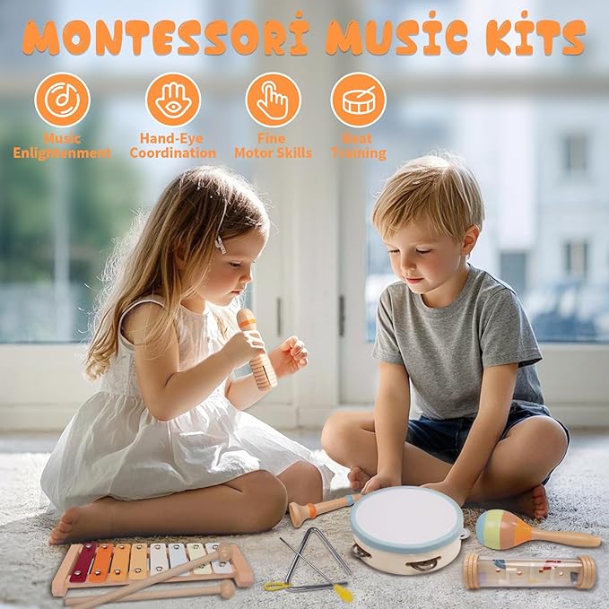 - Baby Musical Instruments Set - Our musical toys Include classic musical instruments such as tambourine, maracas,wood sounder, wood clarinet, xylophone, rain stick, and triangle, each of which makes a crisp and pleasant sound. They can inspire your child's curiosity and desire to explore the world of music